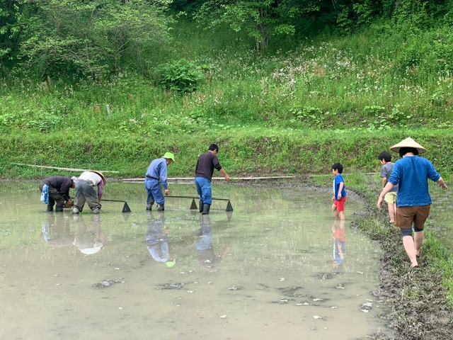 昔ながらの「田植え枠(たうえわく)」を使って一株ずつ手植えし、